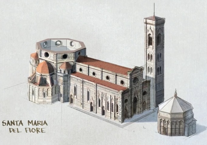 圣母百花大教堂,始建于1296年,最初主体建筑仍然是哥特式,此后,由于佛罗伦萨共和国不断强大,教堂的设计也经过数次修改,规模越来越大。圣母百花大教堂的正门,仍然是典型哥特式建筑。到1367年的时候,佛罗伦萨全民投票决定在教堂的中殿上修建一个史无前例的巨大圆顶。圆顶的下方建筑决定了圆顶的直径是44米,从而超过直径是43.3米的罗马万神殿和直径是31.24米的君士坦丁堡圣索菲亚大教堂。修建罗马万神殿的时候,使用的是古罗马的混凝土技术,这种材料比重非常小,所以能够修建出这么大的一个圆顶,这时罗马混凝土技术早已经失传,建筑如此巨大的穹顶成了技术难题。佛罗伦萨政府一直在竞标,圆顶下部的建筑早就完成,教堂主体却任凭刮风下雨晾了50年。