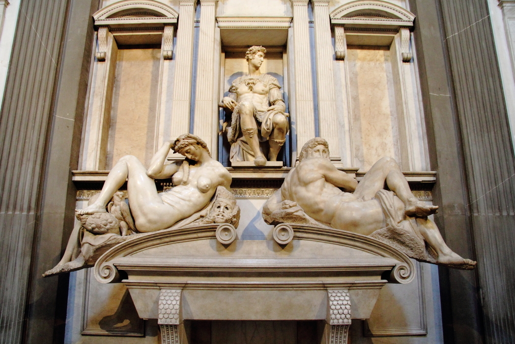 在美第奇家族墓地的雕塑中,比较有名的是朱利亚诺·美第奇墓,朱利亚诺·美第奇[Giuliano di Lorenzo de Medici;1479-1516],是洛伦佐美第奇的第三个儿子。米开朗基罗把朱利亚诺·美第奇雕刻成非常古代英俊武士的模样,肌肉发达得有点夸张,这下面两个雕塑,分别是“日”和“夜”,在一般艺术史书籍中,对这几个雕塑也可能有长篇论述,我这里就不再详细讲述。