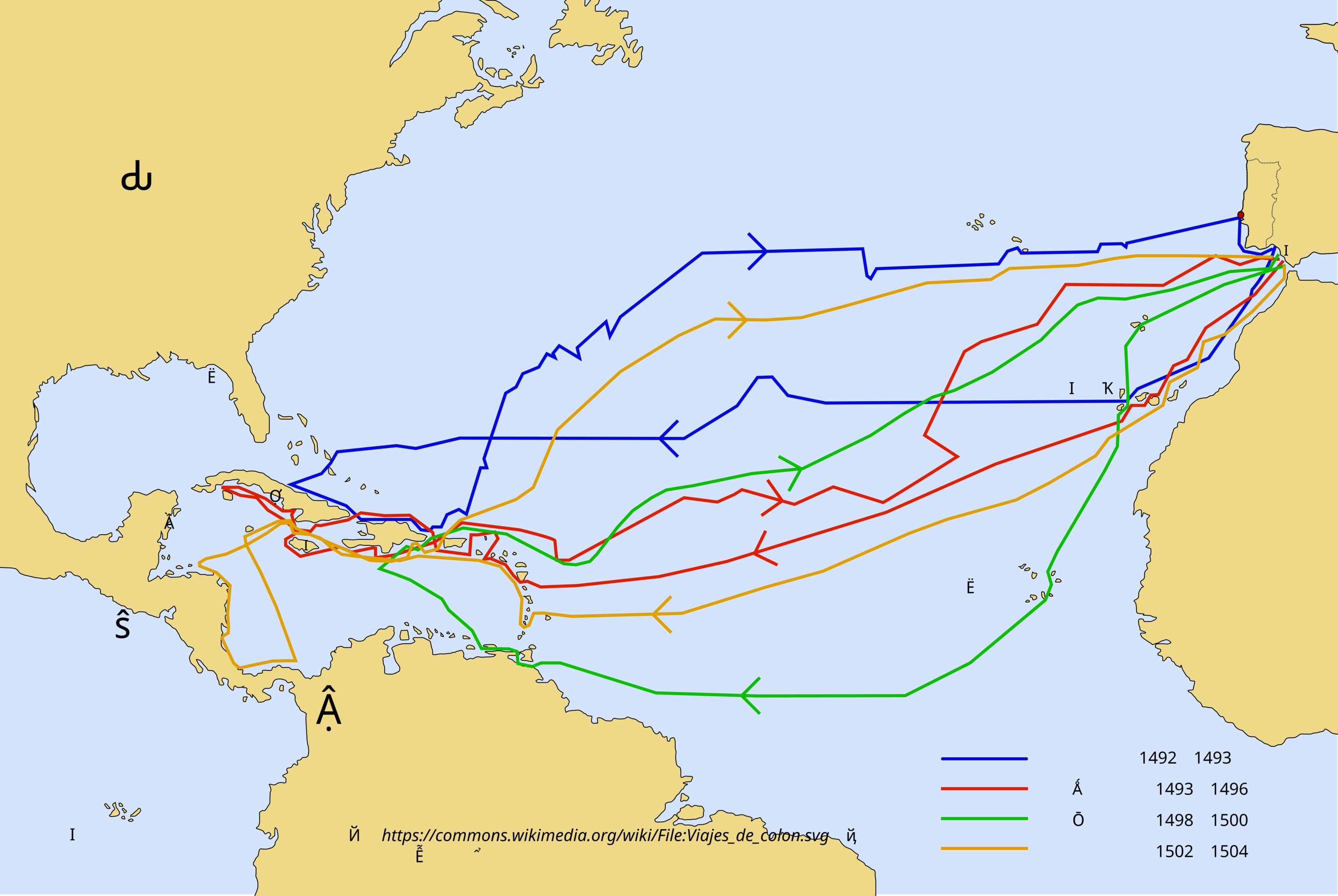 1492年8月3日他们从西班牙出发,9月6日到达加那利群岛,从加那利群岛最西的哥拉美岛[La_Gomera]启航,9月9日哥拉美岛在海平面上消失,彻底离开了欧洲。哥伦布的原始航海日记作为西班牙保密的档案已经无法找到,但是哥伦布的家人曾经要求留下一个抄本。另外当时就有历史学家写书的时候查阅了档案,并且引用了其中一些内容,把这两部分内容拼在一起,构成了今天看到的《哥伦布航海日记》,有张至善编译的中文版。这份日记应该已经被修改过,西班牙需要保密的内容已经被删除了,当时西班牙,葡萄牙的航海的详细情况都是保密的,所以今天遵循这份日记也无法完全还原出当初哥伦布航行的精确路线。